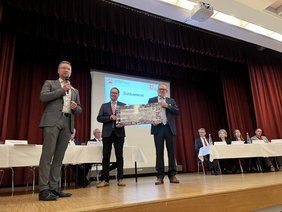 Foto 1: Auf der Jubiläumsfeier der Baugenossenschaft FÖFA Waldshut-Tiengen übergibt FÖFA-Geschäftsführer Andreas Vogt symbolisch einen Scheck von 7.500 Euro an die DESWOS.