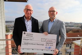 Foto: Norbert Büchelmaier, der Vorsitzende des Kinderschutzbundes Friedrichshafen (links), freut sich über die Weihnachtsspende von SWG-Geschäftsführer Alrik von Kolzenberg.
