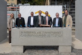 Foto: Grundsteinlegung für das neue Quartier. Ulrike Bachir, Amt für Stadtplanung und Wohnen der Landeshauptstadt Stuttgart, Bernd-Marcel Löffler, Bezirksvorsteher Bad Cannstatt, Martin Schuder, Technischer Direktionsleiter Ed. Züblin AG – Direktion Stuttgart, Wolf Gieske, Technischer Geschäftsführer der SWSG, Samir M. Sidgi, Vorsitzender der Geschäftsführung der SWSG, Peter Pätzold, Bürgermeister für Städtebau, Wohnen und Umw elt der Landeshauptstadt Stuttgart, Thomas Schüler, Architekt und Gründer Thomas Schüler Architekten Stadtplaner (von links).