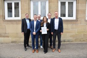 Foto (v.l.n.r.): Peter Hasmann, Vorstand der Baugenossenschaft Bad Cannstatt eG, Christian Reinhard, Vorstand der Baugenossenschaft Feuerbach-Weilimdorf eG, Michael Schäfer, Vorstand der GWF Wohnungsgenossenschaft eG, Katharina Schaible, Institutsleiter Prof. Markus Mändle, Andreas Knoke, Vorstand der Baugenossenschaft Gartenstadt Luginsland eG