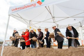 Bild: Mit dem symbolischen ersten Spatenstich von Politik, Bau- und Projektbeteiligten sowie Stakeholdern beginnt traditionell die Bauphase für die neue Kita in Karlsruhe-Oberreut. V.l.n.r.: Christoph Klinkott (Klinkott Architekten), Ayse Saglam und Susanne Brinkmann (Projektleitungen Volkswohnung), Frederick Kassnel (Bürgerverein Oberreut), Stefan Storz (Geschäftsführer Volkswohnung), Sozialdezernentin Yvette Melchien, Markus Barton (Geschäftsführer AWO Karlsruhe) und Bernhard Bauer (Geschäftsführung DIRINGER & SCHEIDEL).