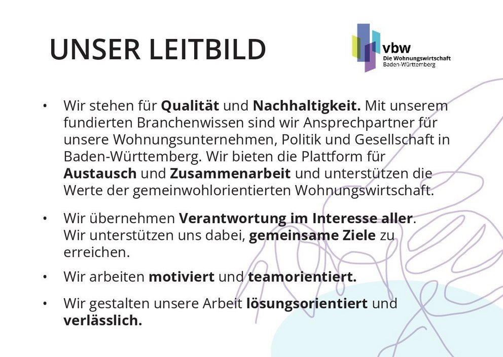 Wir alle, die Gesamtheit der Mitarbeiterinnen und Mitarbeiter, sind der vbw. Wir arbeiten ständig daran, besser zu werden. Wir sind als Prüfungsverband und Interessensvertretung unseren Mitgliedsunternehmen und ihren Zielen verpflichtet.