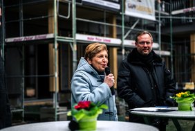 Bildunterschrift: Nicole Razavi, Ministerin für Landesentwicklung und Wohnen in Baden-Württemberg, war zu Gast beim Richtfest für ein Wohnprojekt in Ulm, im dem künftig 250 Menschen leben sollen.